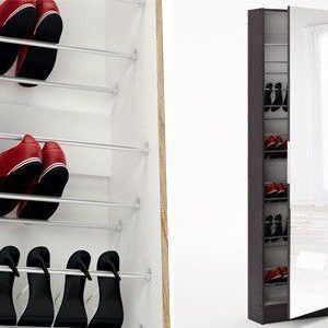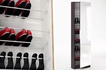 Doubly useful, this shoe cabinet conceals up to 20 pairs behind a full-length mirror.