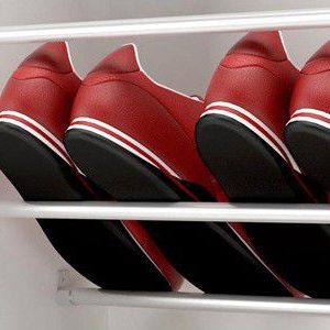 The cabinet’s frame cuts a modern shape, while inside five shelves provide storage for flats, heels and everything in between.